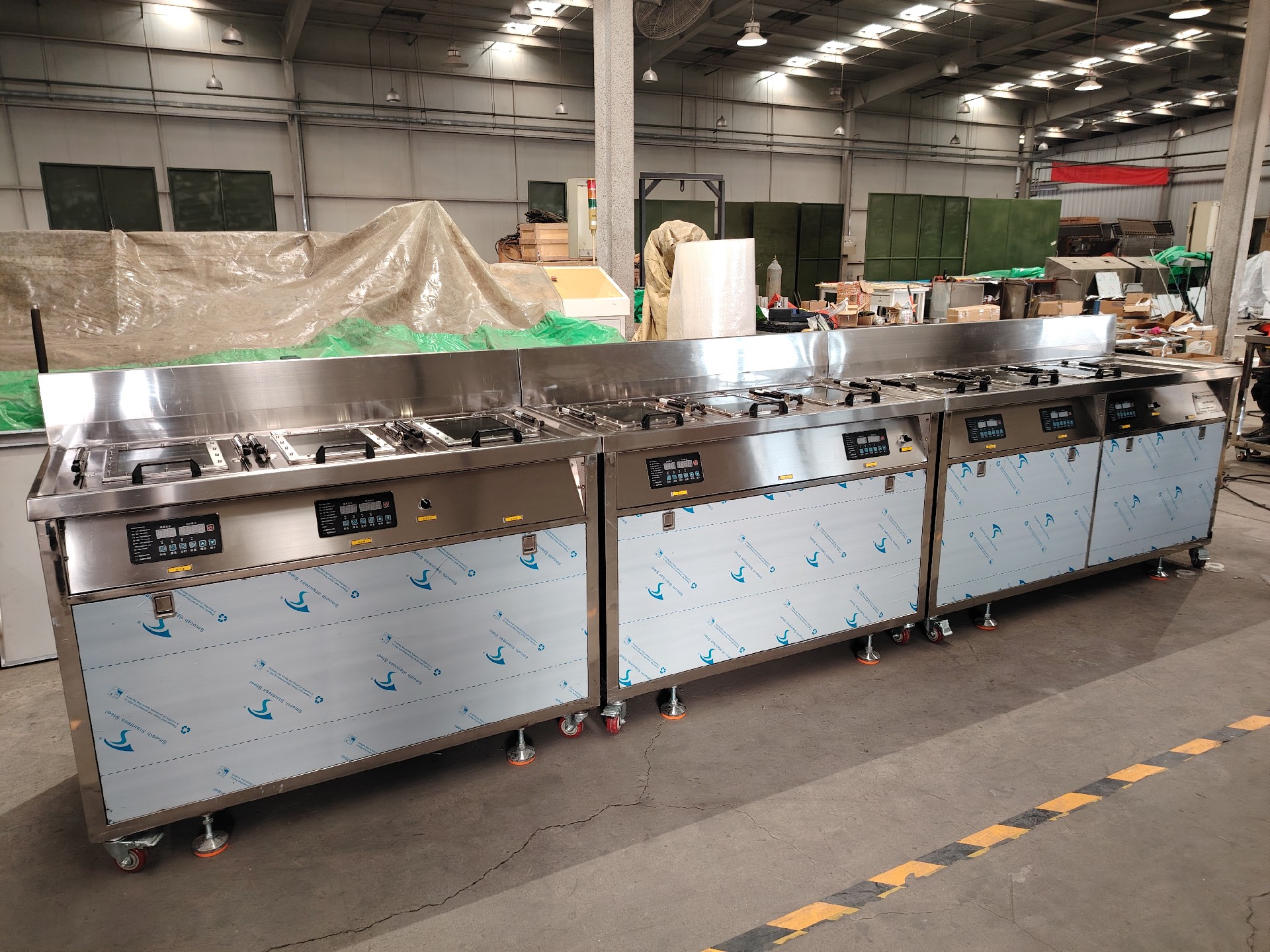 我公司特设计以下清洗工艺:进料→1超声波清洗槽→2超声波清洗槽→3超声波清洗槽→4钝化槽(带加热)→5水洗槽→6配位剂槽(带加热)→7水洗槽→8