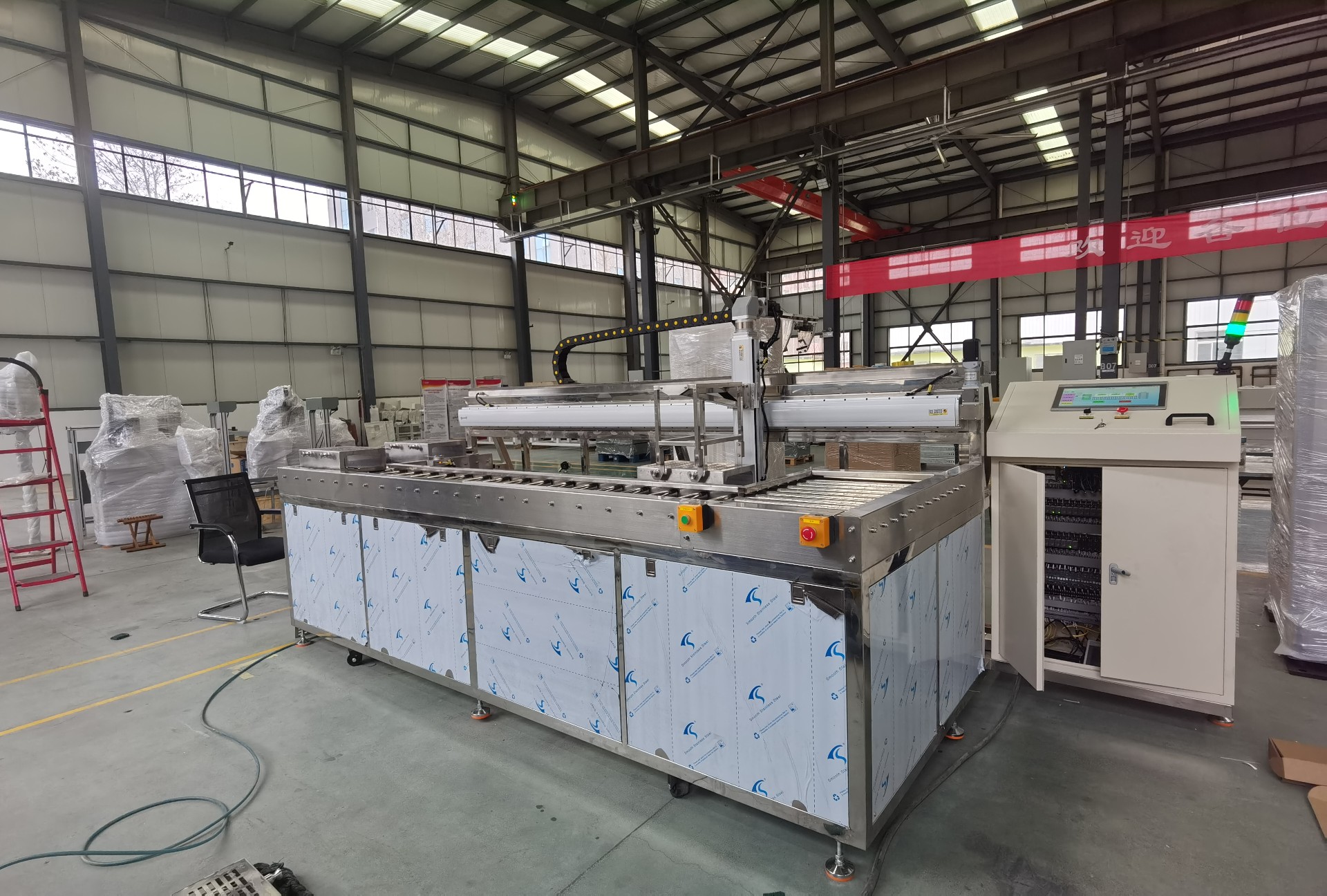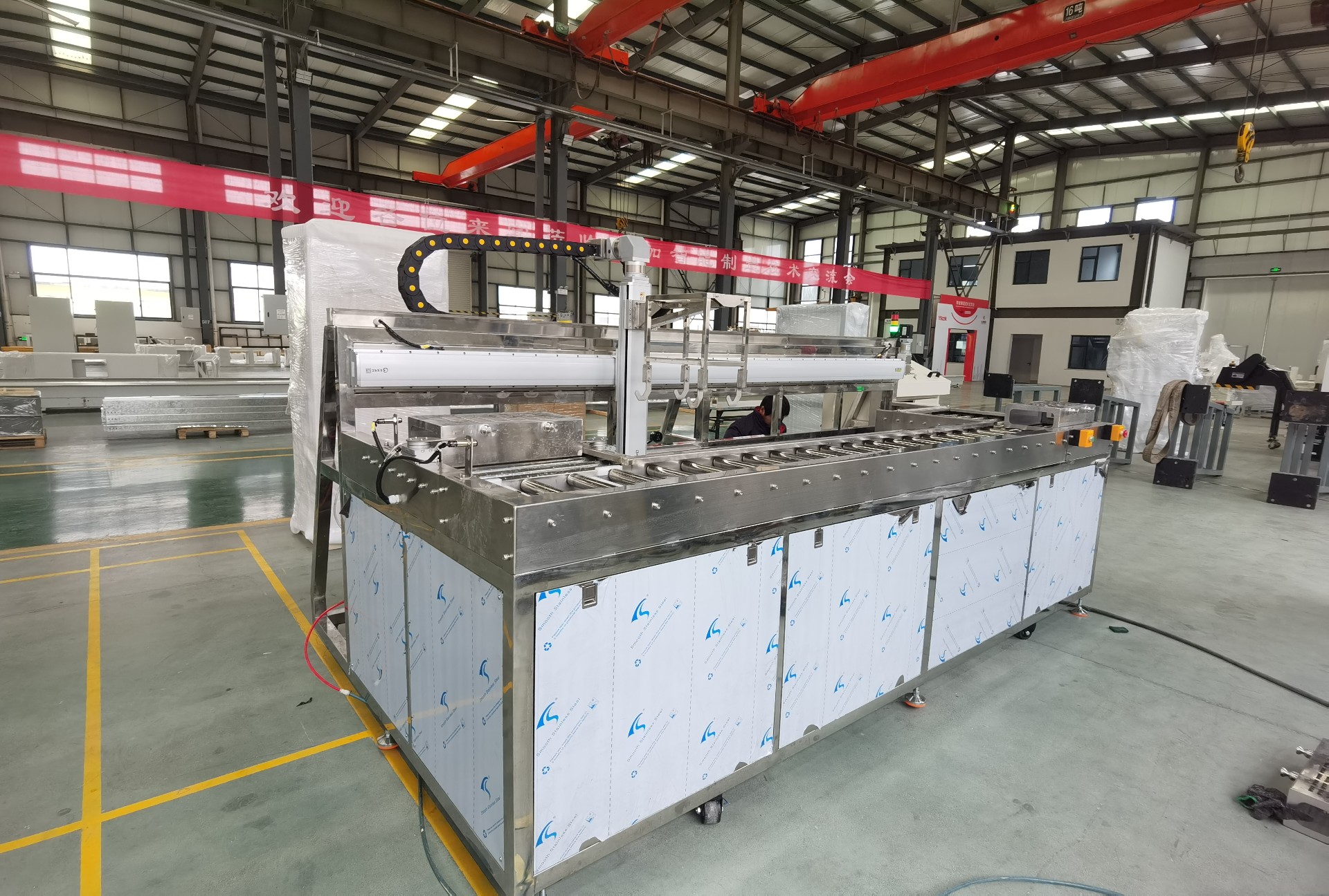 设备描述:该设备是一套敞开式全自动单臂式超声波清洗机,由不锈钢材质制作的超声波除油清洗槽、超声波漂洗槽、热风循环烘干槽。工作程序:采用全自动单臂式机构传送料筐从左进右出,工件料筐放在上料台位置通过机器人摆放凸轮片,在上料台位置摆放好工件后机器人给清洗机一个信号料筐自动进入到清洗机上料位置,机械手过来提取料筐放入到第一个清洗槽内对工件表面的油污等附着物清洗,烘干完毕后机械手将从烘干槽内提出料筐放到下料台上,操作者将工件从料筐内取出完成清洗工作。在把空料筐放到回转输送线上自动回到上料位置。